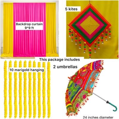 This package includes stitched backdrop curtain, 5 kites, 10 marigold hangings and 2 umbrellas