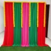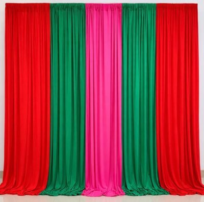 1- Stitched backdrop curtain as in the image – 10ft Height, 9ft Wide of color combination red ,green and ani pink as shown in the image.